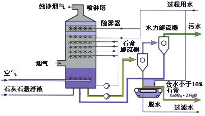 锅炉产生的烟气经除尘后,由引风机正压吹入喷淋脱硫塔内(烟气进口设置在脱硫塔中部),在脱硫塔的入口处设置了预降温系统,经过降温后的烟气进入脱硫塔。在塔内设三层雾化系统,在该区段空间充满着由雾化器喷出的粒径为100~300μm的雾化液滴,烟气中SO2与吸收碱液充分反应,脱除二氧化硫。脱硫后的液体落入脱硫塔底部,定时定期排入脱硫塔后设置的收集系统,适当补充一定量的碱液后经循环泵再次送入喷雾和配液系统中再次利用,脱硫剂始终处于循环状态。经多次循环后的脱硫浆液排入后处理系统,脱硫后的烟气通过塔顶除雾器时,利用其导向作用产生强大的离心力,将烟气中的液滴分离出来,达到同时除尘除雾的效果。洁净烟气终达标排放。